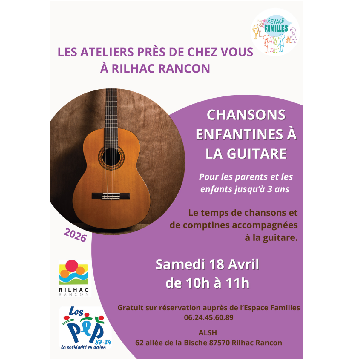 Sur réservation auprès de l'Espace Familles au 06 24 45 60 89 / ALSH 62,allée de la Bische (Rilhac-Rancon)