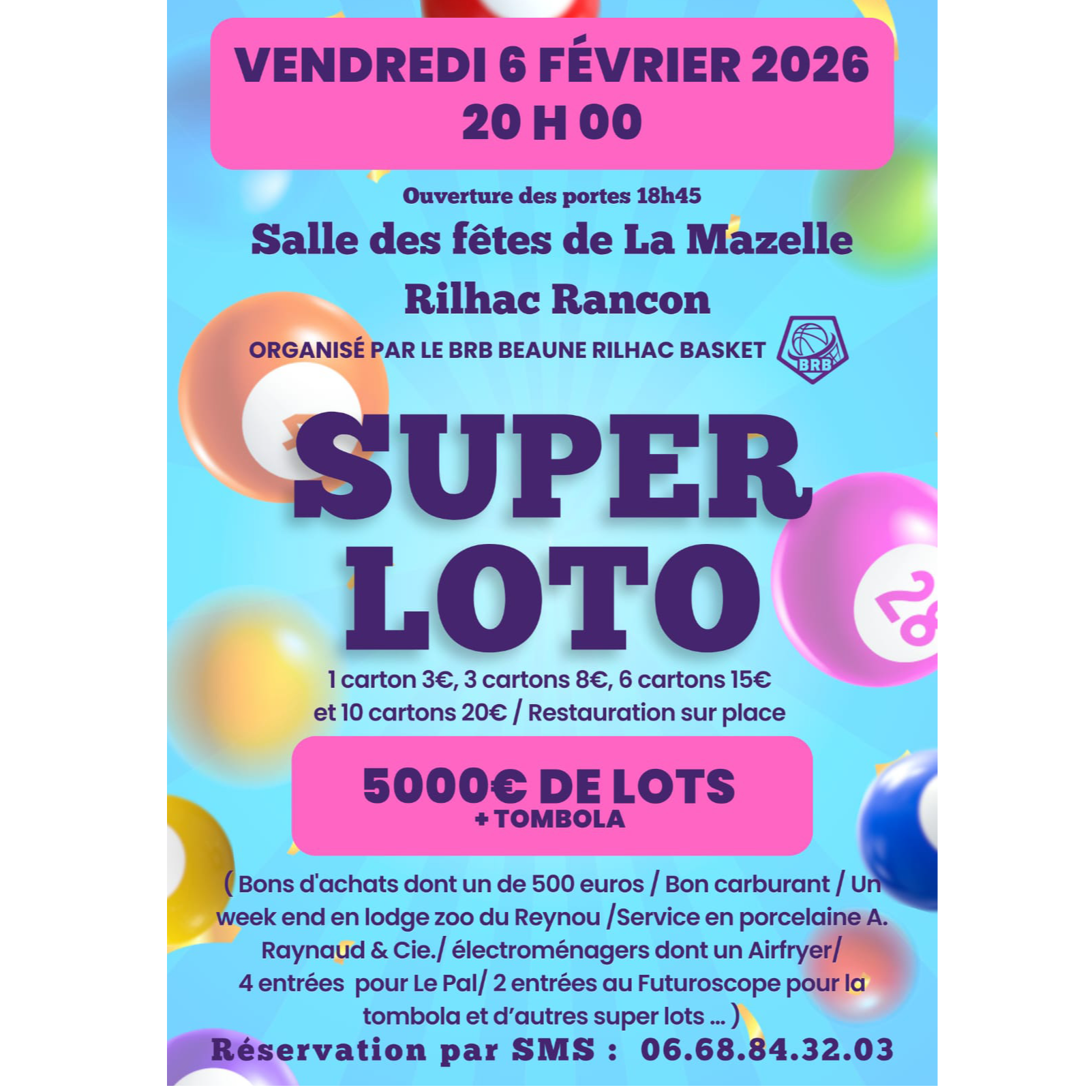 L'Association Beaune Rilhac Basket (BRB) organise un "LOTO", le Vendredi 6 février 2026 à 19H à l'Espace Mazelle de Rilhac-Rancon.