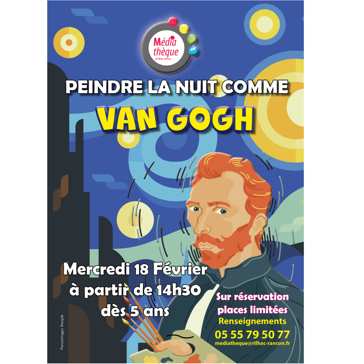 L'équipe de la médiathèque vous propose et dès 5 ans "PEINDRE LA NUIT COMME VAN GOGH", le mercredi 18 février à partir de 14H30.