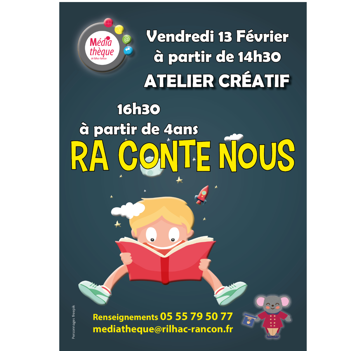L'équipe de la médiathèque te propose un Atelier Créatif à partir de 14H30 mais aussi de venir découvrir une aventure contée "RA CONTE NOUS", dès 4 ans à partir de 16H30.