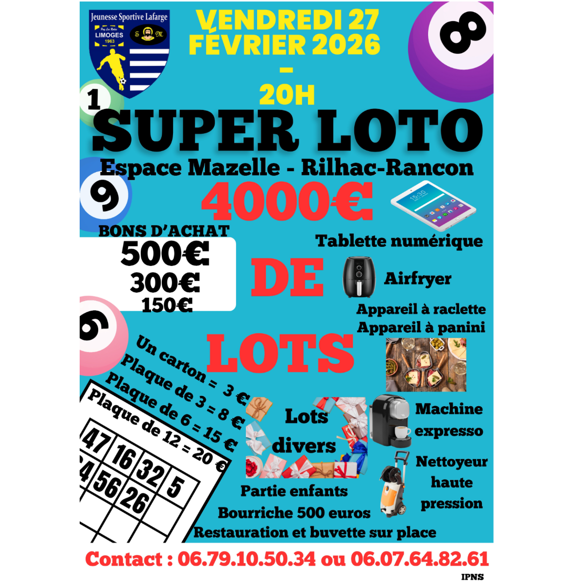 SUPER LOTO organisé par Jeunesse Sportive Lafarge, le Vendredi 27 février 2026 à 19h à l'Espace Mazelle (Rilhac-Rancon).