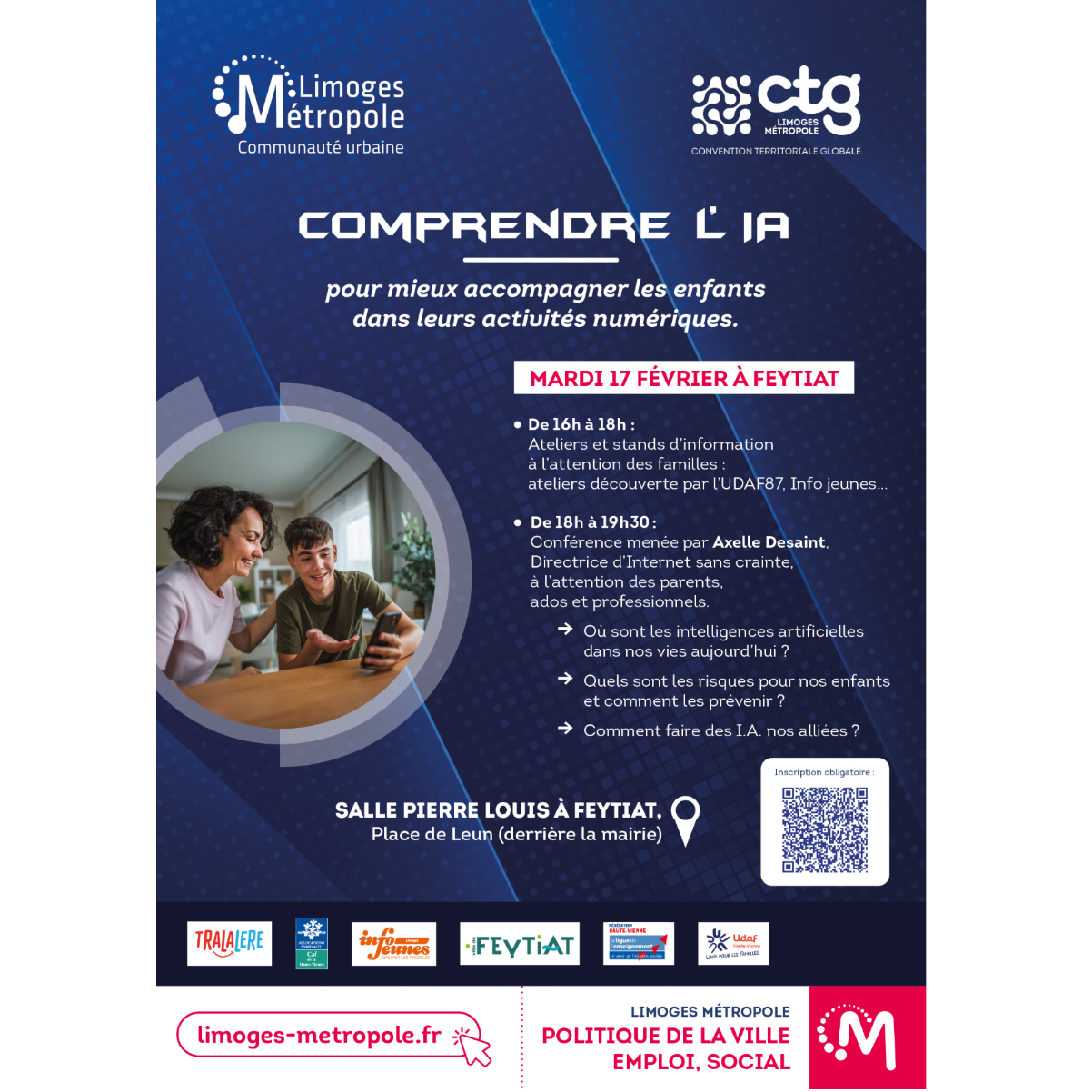 Limoges Métropole et le CTG (Convention Territorial Globale) vous propose "COMPRENDRE L'IA", mardi 17 février à Feytiat, Salle Pierre louis, Place de Leun (derrière la mairie)
