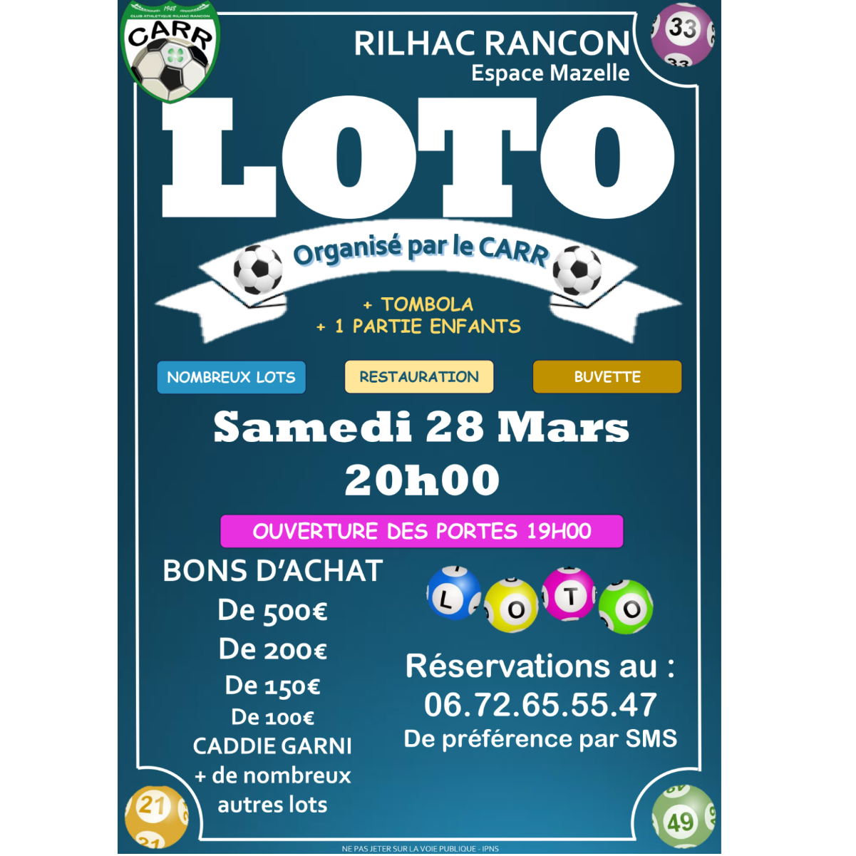 Le Club de Foot de Rilhac-Rancon (CARR), organise un LOTO, le samedi 28 mars 2026, Salle Paul ÉLUARD (Espace Mazelle) à partir de 19H.