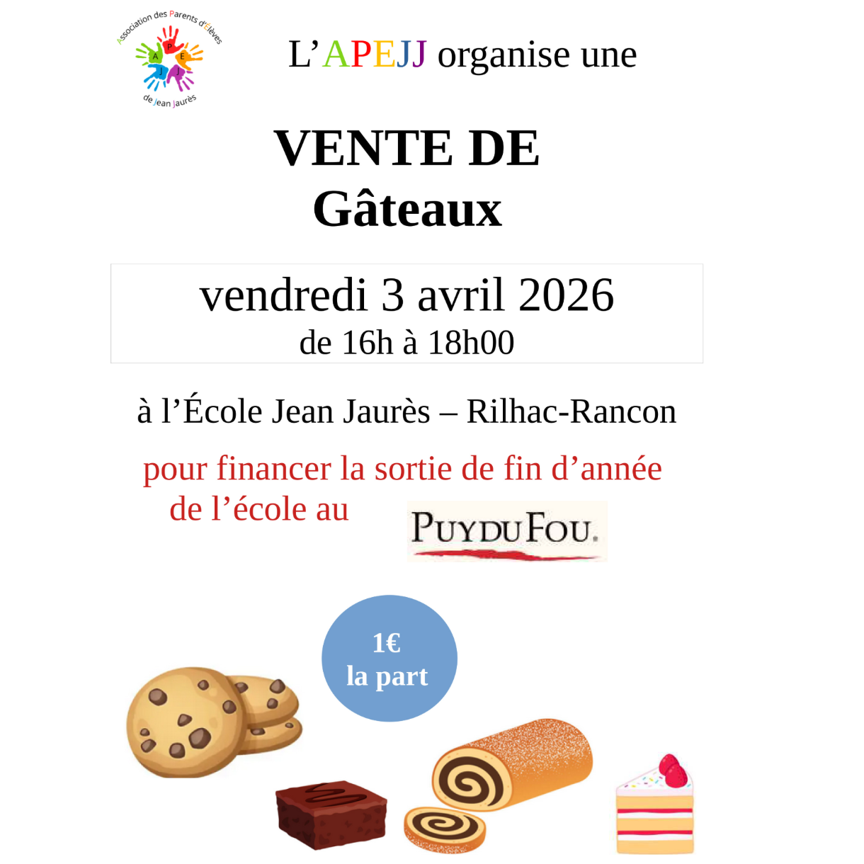 L'association des Parents d'Élèves de Jean Jaurès (APEJJ) organise une vente de gâteaux le vendredi 3 avril 2026 de 16H à 18H à L'école Jean Jaurès de Rilhac-Rancon afin de financer la sortie de fin d'année de l'école au PUY du FOU.