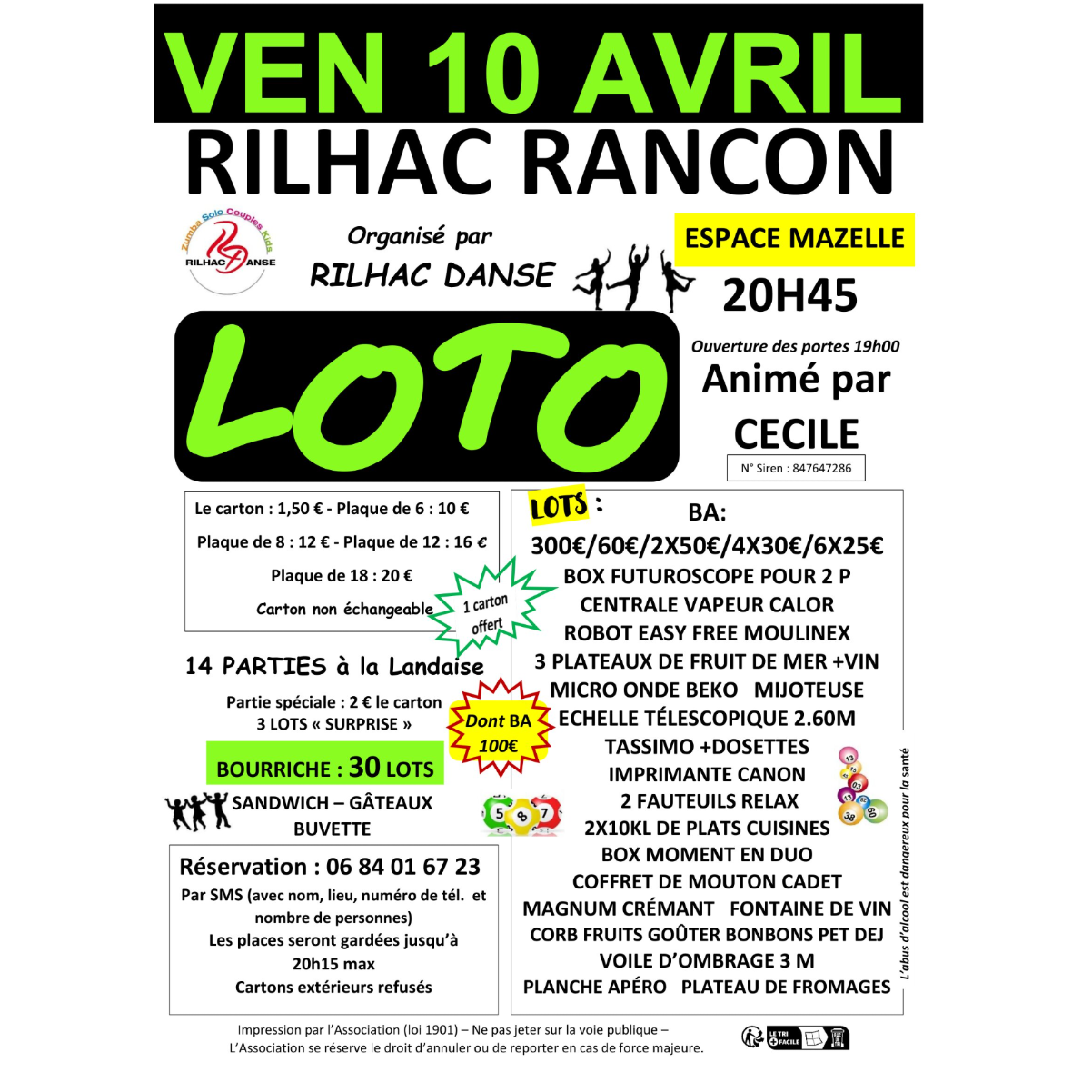 L'association RILHAC DANSE organise un LOTO le 10 avril 2026 à l'Espace MAZELLE à 20H45.