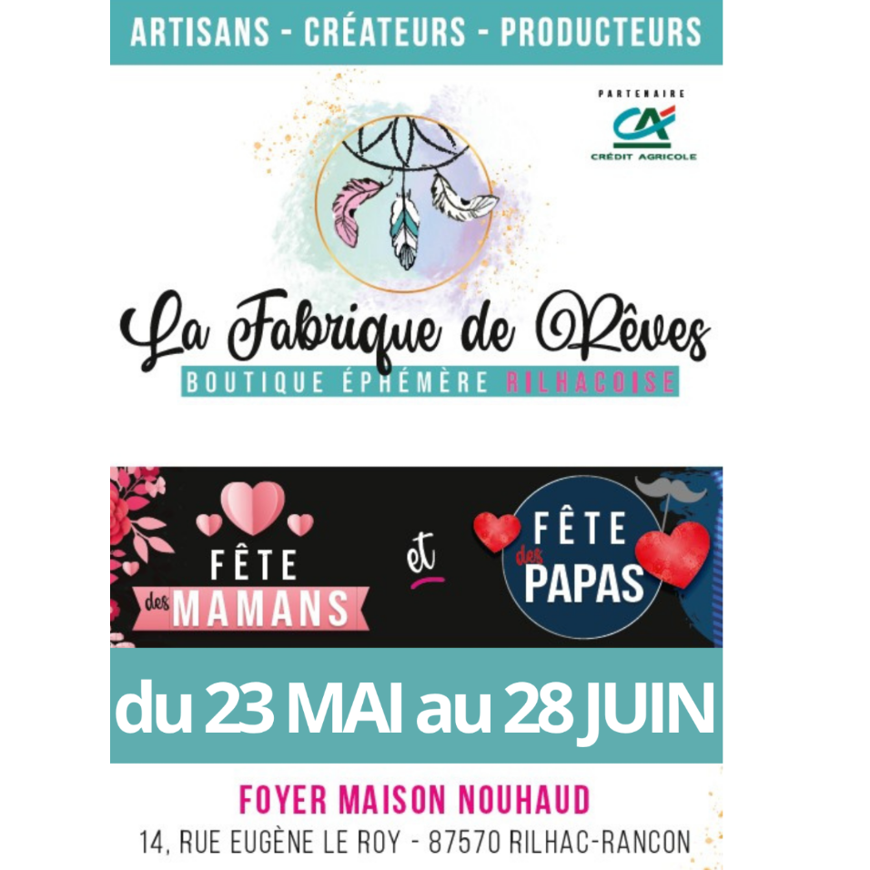 Les créateurs de la boutique éphémère « La fabrique de rêves », installée à la Maison NOUHAUD (14 rue Eugène Leroy), vous accueillent à l’occasion de la fête des mères et de la fête des pères, du 23 mai au 28 juin 2026, dans l’annexe de la maison.